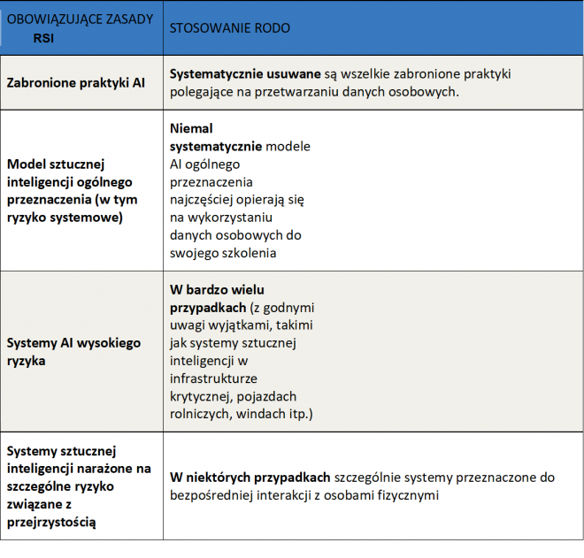 - RSI ma zastosowanie samodzielnie: będzie tak w przypadku dostawcy systemu sztucznej inteligencji wysokiego ryzyka, który nie wymaga danych osobowych ani do jego opracowania, ani do wdrożenia.